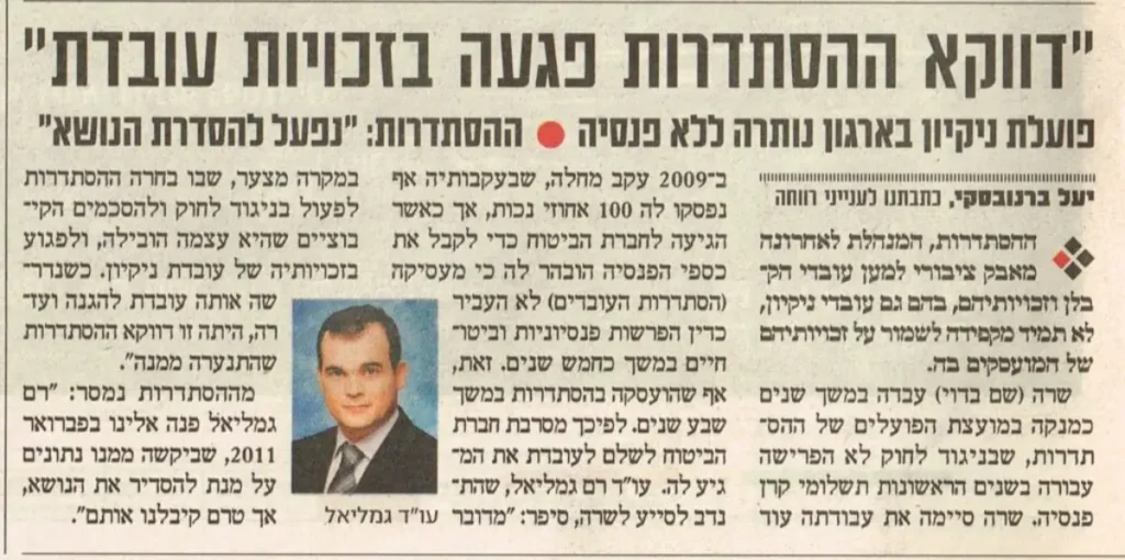 שרה (שם בדוי) עבדה במשך שנים כמנקה במועדת הפועלים של ההסתדרות, שבניגוד לחוק לא הפרישה עבורה בשנים הראשונות תשלומי קרן פנסיה.