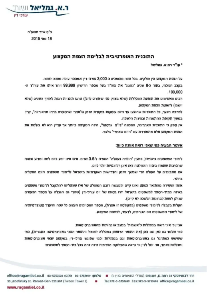 התוכנית הזו, שאפשר ליישם אותה כמעט מיידית, אם הלשכה תסכים לקדם חקיקה בנושא- יכולה להציל את המקצוע שלנו מבינוניות, ולהציל את המקצוע שלנו מהצפה, ולהציל הרבה מאוד עורכי דין צעירים.