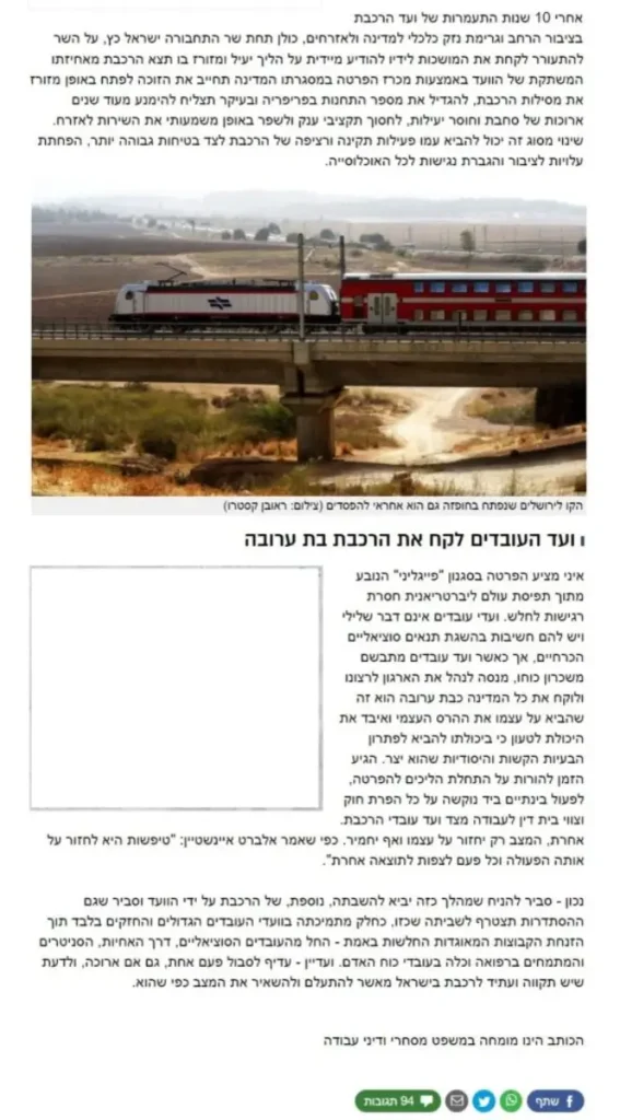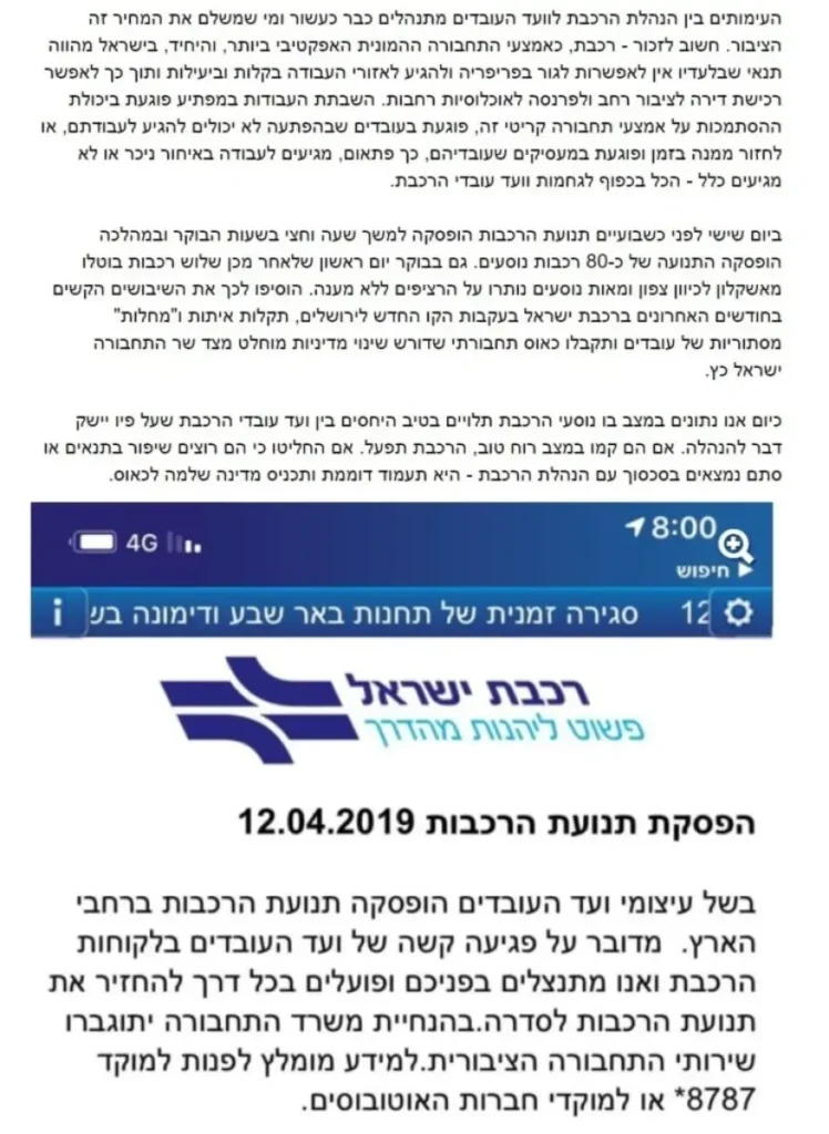 העימותים בין הנהלת הרכבת לוועד העובדים מתנהלים כבר כעשור ומי שמשלם את המחיר זה הציבור. חשוב לזכור – רכבת, כאמצעי התחבורה ההמונית האפקטיבי ביותר, והיחיד, בישראל מהווה תנאי שבלעדיו אין לאפשרות לגור בפריפריה ולהגיע לאזורי העבודה בקלות וביעילות ותוך כך לאפשר רכישת דירה לציבור רחב ולפרנסה לאוכלוסיות רחבות. השבתת העבודות במפתיע פוגעת ביכולת ההסתמכות על אמצעי תחבורה קריטי זה, פוגעת בעובדים שבהפתעה לא יכולים להגיע לעבודתם, או לחזור ממנה בזמן ופוגעת במעסיקים שעובדיהם, כך פתאום, מגיעים לעבודה באיחור ניכר או לא מגיעים כלל – הכל בכפוף לגחמות וועד עובדי הרכבת.