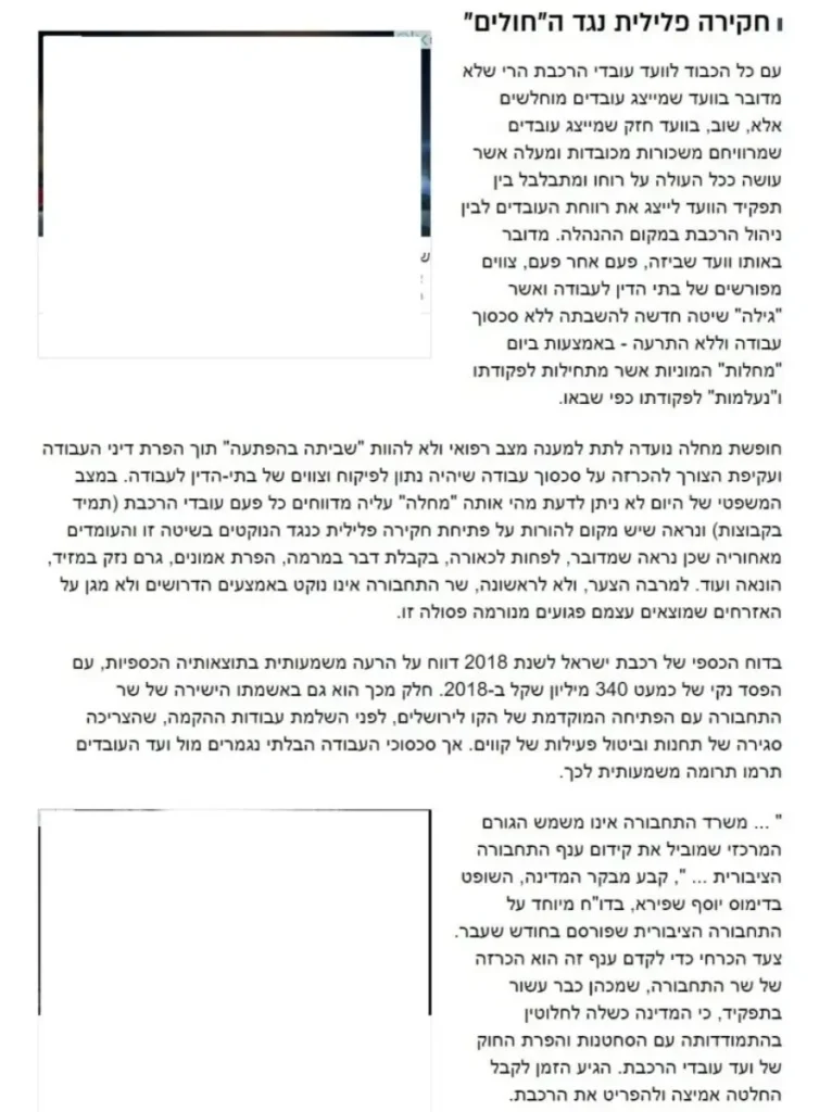 עם כל הכבוד לוועד עובדי הרכבת הרי שלא מדובר בוועד שמייצג עובדים מוחלשים אלא, שוב, בוועד חזק שמייצג עובדים שמרוויחם משכורות מכובדות ומעלה אשר עושה ככל העולה על רוחו ומתבלבל בין תפקיד הוועד לייצג את רווחת העובדים לבין ניהול הרכבת במקום ההנהלה. מדובר באותו וועד שביזה, פעם אחר פעם, צווים מפורשים של בתי הדין לעבודה ואשר "גילה" שיטה חדשה להשבתה ללא סכסוך עבודה וללא התרעה – באמצעות ביום "מחלות" המוניות אשר מתחילות לפקודתו ו"נעלמות" לפקודתו כפי שבאו.