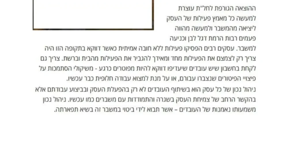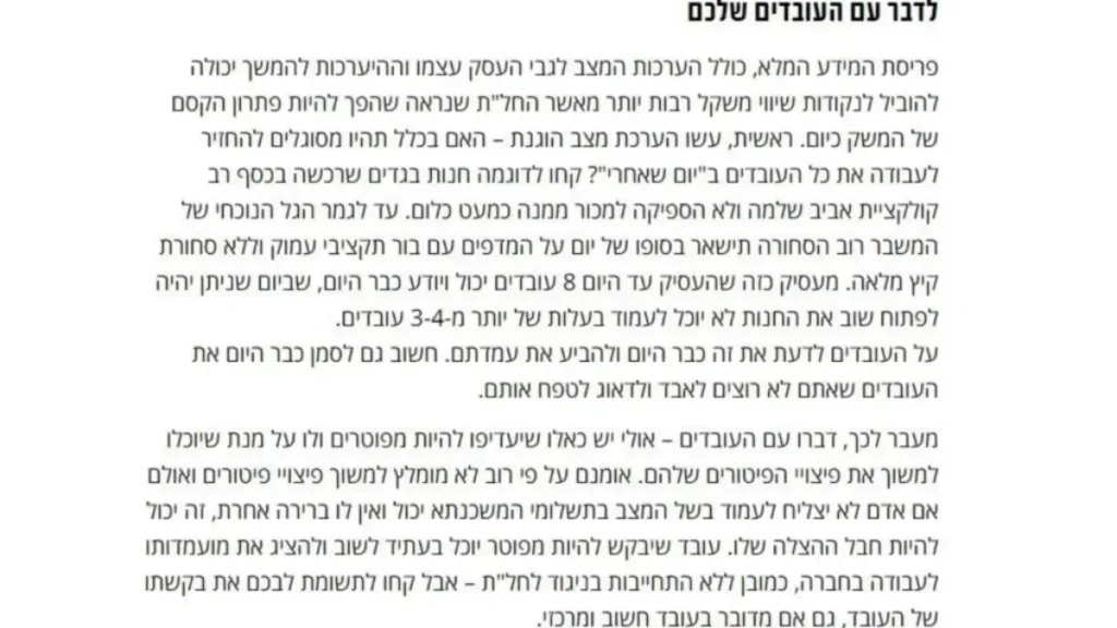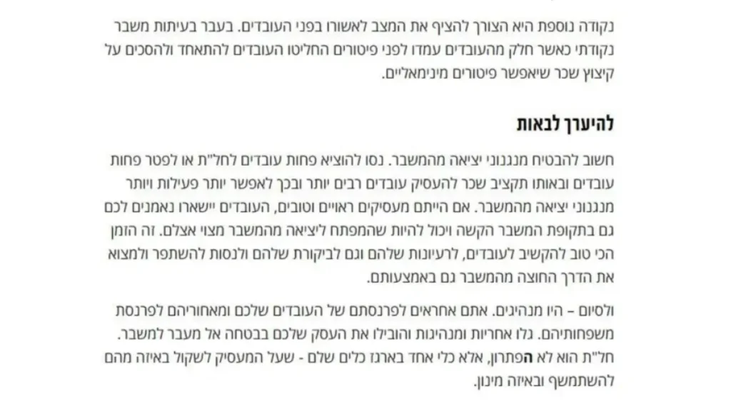 "חשוב להבטיח מנגנוני יציאה מהמשבר. נסו להוציא פחות עובדים לחל"ת או לפטר פחות עובדים ובאותו תקציב שכר להעסיק עובדים רבים יותר ובכך לאפשר יותר פעילות ויותר מנגנוני יציאה מהמשבר. אם הייתם מעסיקים ראויים וטובים, העובדים יישארו נאמנים לכם גם בתקופת המשבר הקשה ויכול להיות שהמפתח ליציאה מהמשבר מצוי אצלם".